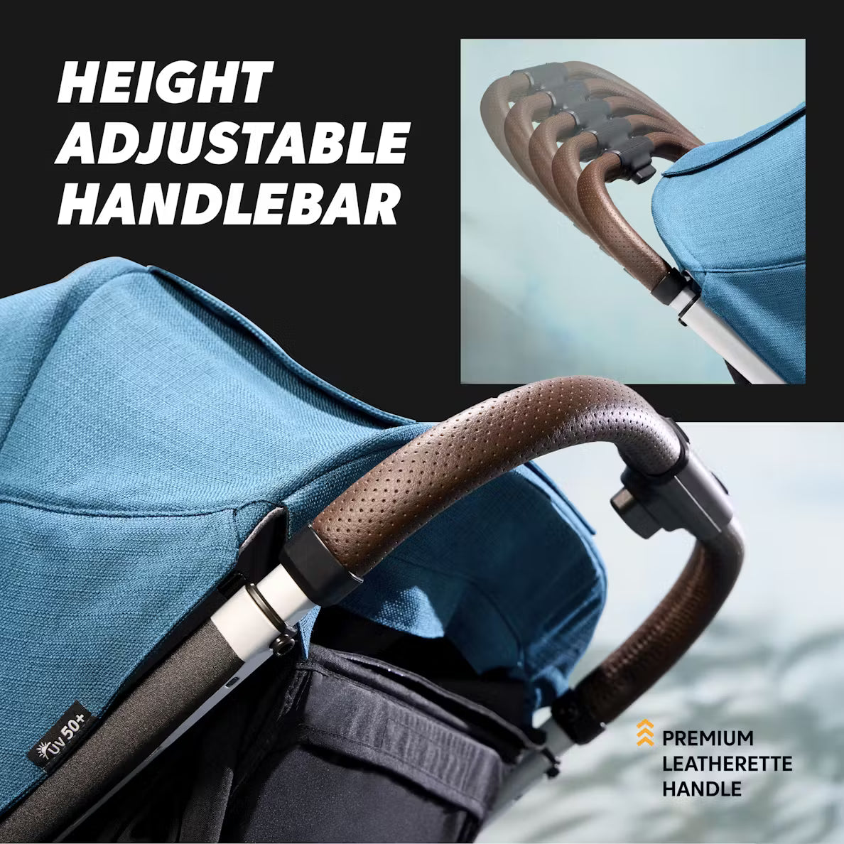 - Height-adjustable handlebar with leatherette grip provides a premium push experience