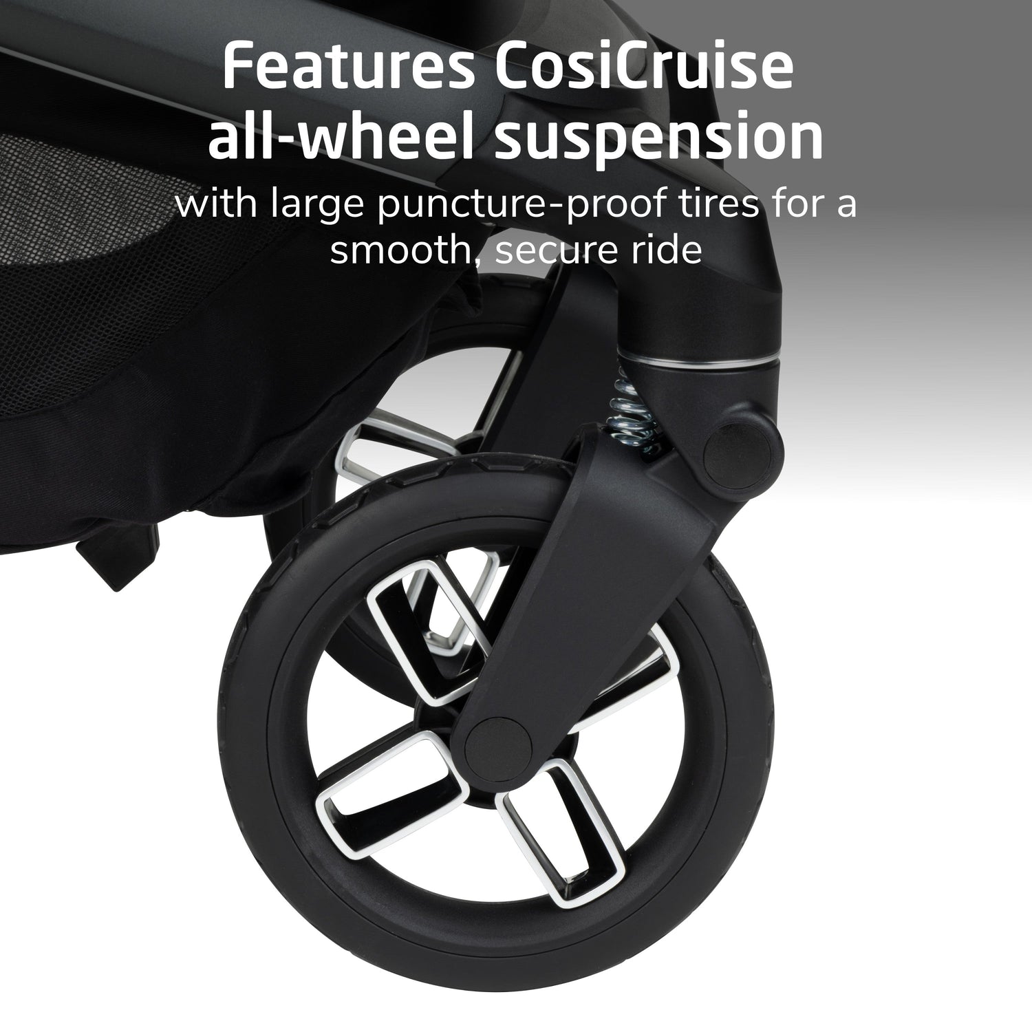 - Features CosiCruise all-wheel suspension with large puncture-proof tires for a smooth, secure ride over mixed terrains; lockable front wheels