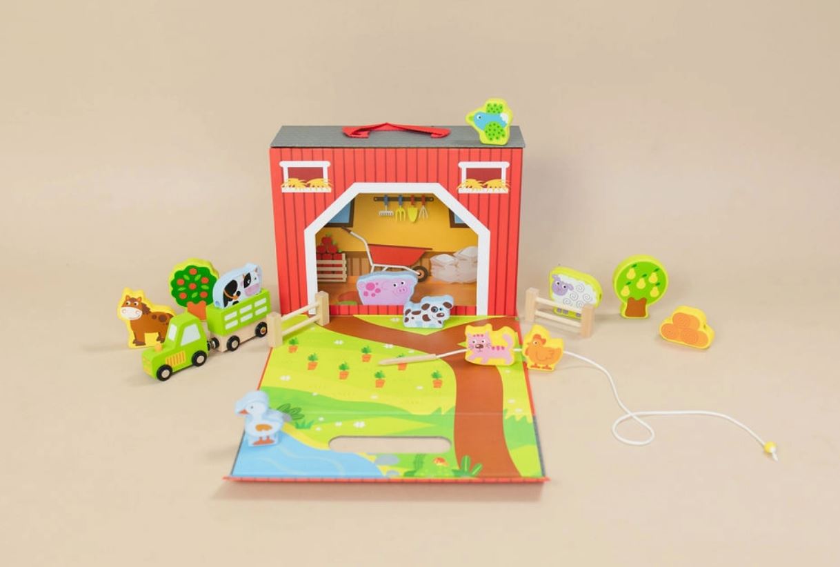 What sets this set apart? Each wooden play piece doubles as a bead, featuring a hole for lacing fun. The tractor and trailer connect with magnets, adding dynamic, interactive fun as children transport their farm friends across the scenery.